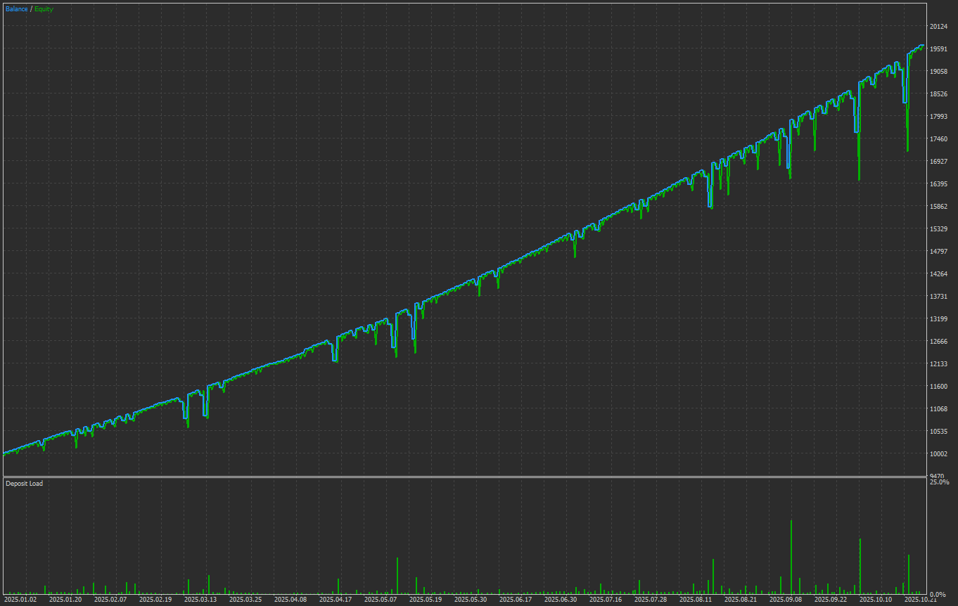 The EA maintained a clean fairness curve with low drawdown, exhibiting robust adaptability to the NAS100 market construction all through 2025.