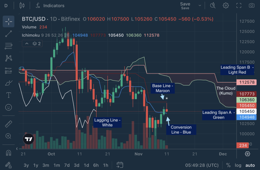 Now, let’s see how these fundamentals line up with the Ichimoku Cloud on the each day BTC/USD chart on November eleventh, 2025 and whether or not the technical image helps this narrative of managed consolidation.