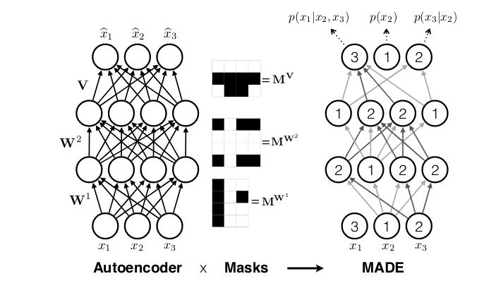 Whereas in recurrent neural networks, autoregressivity is conserved as a result of recurrence relation inherent in state updating, it’s not clear a priori how autoregressivity is to be achieved in a densely related structure. A computationally environment friendly resolution was proposed in MADE: Masked Autoencoder for Distribution Estimation(Germain et al. 2015): Ranging from a densely related layer, masks out all connections that shouldn’t be allowed, i.e., all connections from enter characteristic (i) to mentioned layer’s activations (1 … i-1). Or expressed in another way, activation (i) could also be related to enter options (1 … i-1) solely. Then when including extra layers, care should be taken to make sure that all required connections are masked in order that on the finish, output (i) will solely ever have seen inputs (1 … i-1).