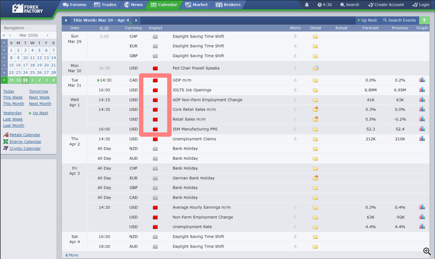 To trace such occasions, it’s handy to make use of the Foreign exchange Manufacturing facility financial calendar, the place information is categorized by influence and launch time.
