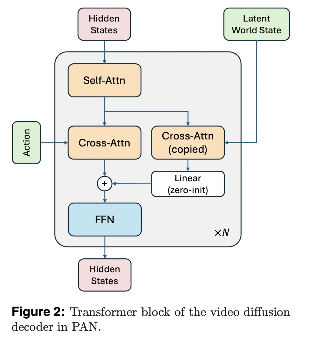 In PAN, the imaginative and prescient encoder and spine are constructed on Qwen2.5-VL-7B-Instruct. The imaginative and prescient tower tokenizes frames into patches and produces structured embeddings. The language spine runs over a historical past of world states and actions, plus realized question tokens, and outputs the latent illustration of the subsequent world state. These latents reside within the shared multimodal house of the VLM, which helps floor the dynamics in each textual content and imaginative and prescient.