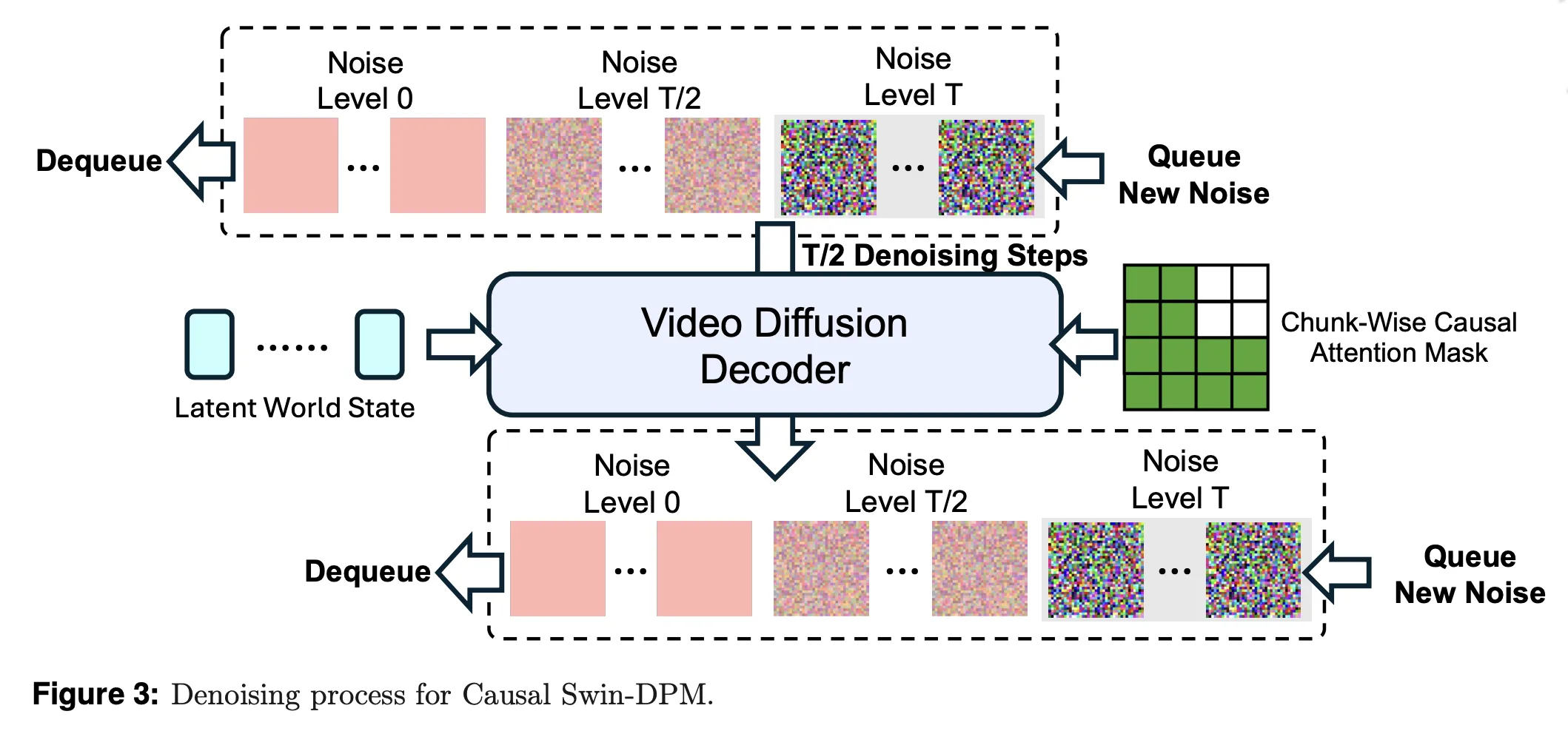 The decoder operates on a sliding temporal window that holds two chunks of video frames at totally different noise ranges. Throughout denoising, one chunk strikes from excessive noise to scrub frames after which leaves the window. A brand new noisy chunk enters on the different finish. Chunk sensible causal consideration ensures that the later chunk can solely attend to the sooner one, to not unseen future actions. This retains transitions between chunks easy and reduces error accumulation over lengthy horizons.