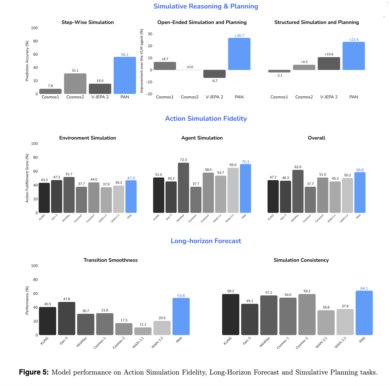 For simulative reasoning and planning, PAN is used as an inner simulator inside an OpenAI-o3 primarily based agent loop. In step sensible simulation, PAN achieves 56.1% accuracy, the most effective amongst open supply world fashions.