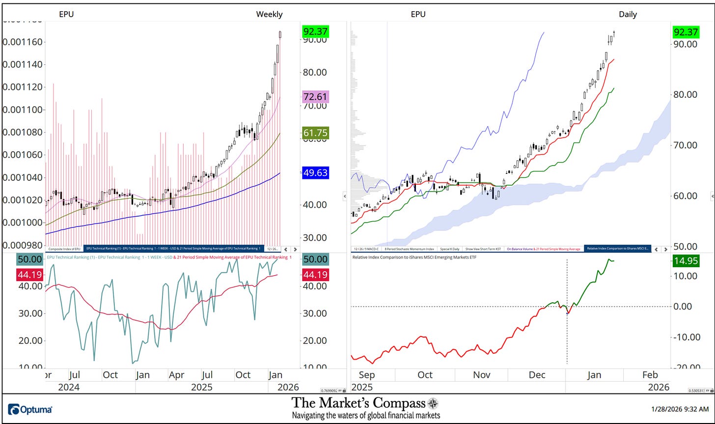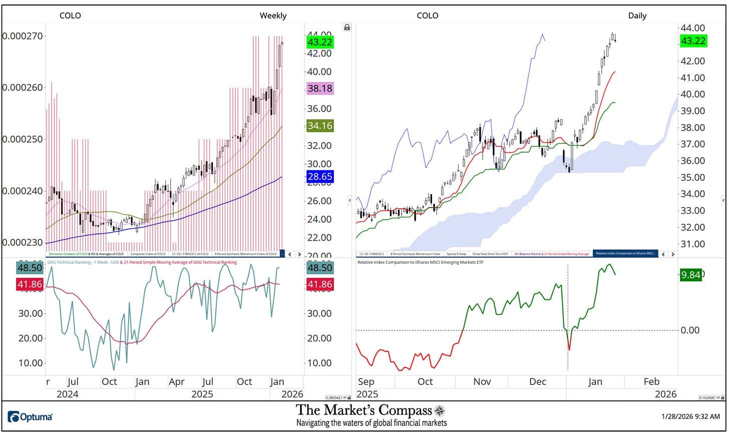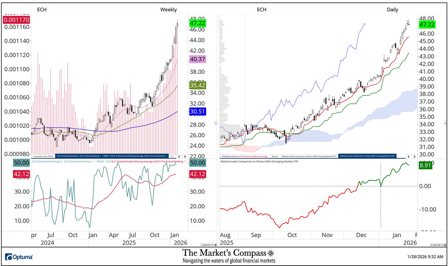 What follows are the charts of the 5 Lat/AM that I observe within the Market’s Compass Rising Markets Nation ETF Research that’s despatched to my paid subscribers. It is a “one off” that focuses on the currencies of the 5 ETFs that’s posted on the Weekly charts as a histogram (crimson horizontal strains) on the left as properly within the decrease panel of the Weekly chart is my Goal Technical Rating which is the spine of the EM Research that may vary between 0 and 50.