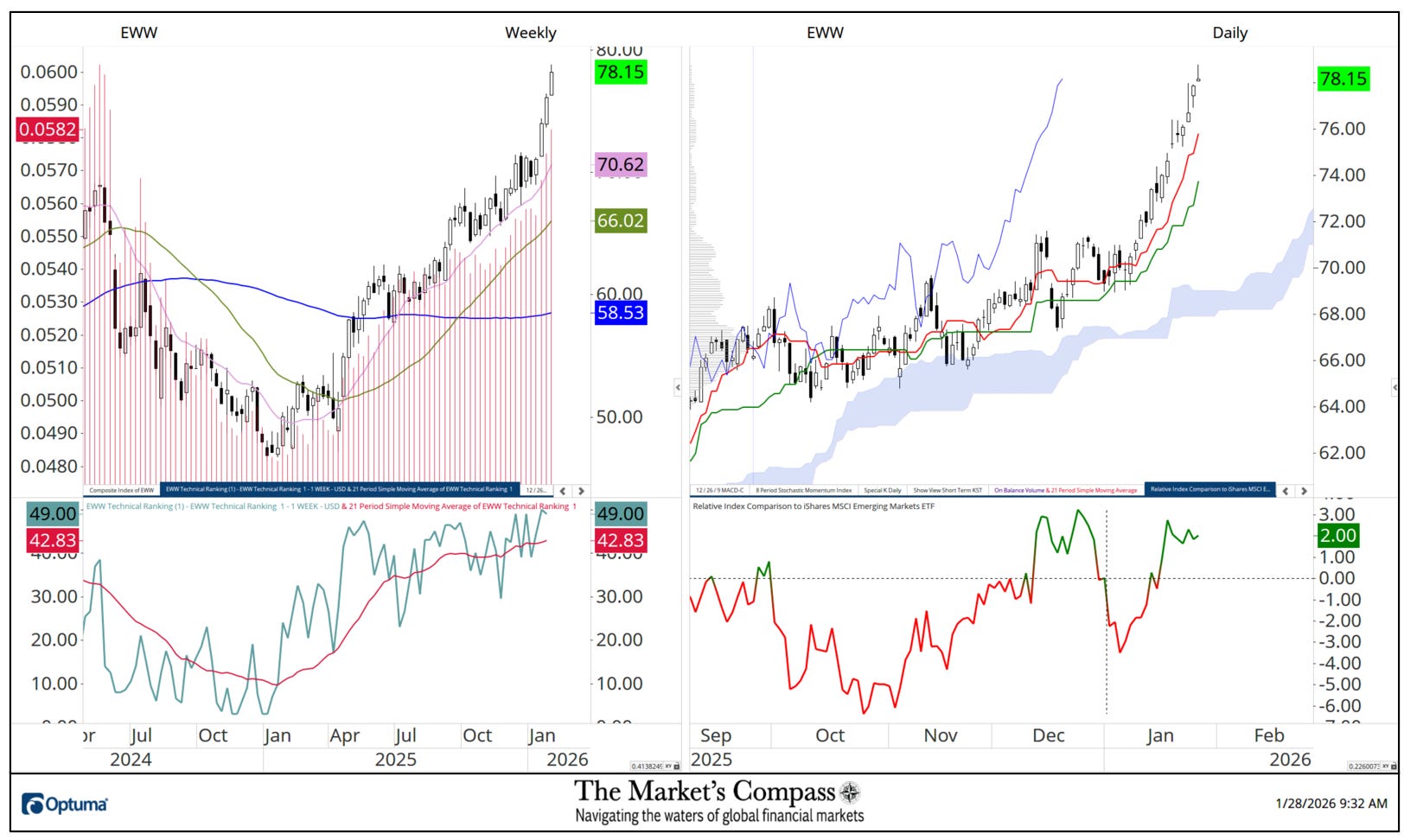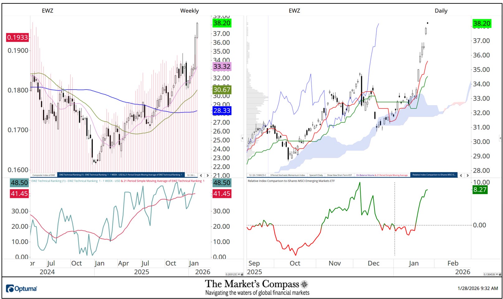 What follows are the charts of the 5 Lat/AM that I observe within the Market’s Compass Rising Markets Nation ETF Research that’s despatched to my paid subscribers. It is a “one off” that focuses on the currencies of the 5 ETFs that’s posted on the Weekly charts as a histogram (crimson horizontal strains) on the left as properly within the decrease panel of the Weekly chart is my Goal Technical Rating which is the spine of the EM Research that may vary between 0 and 50.