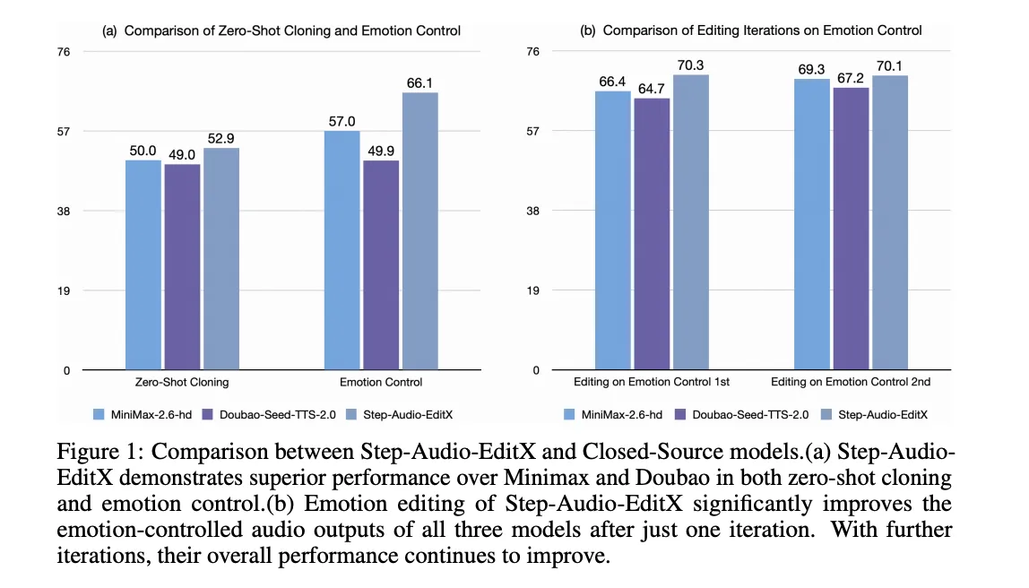 The identical enhancing mannequin is utilized to 4 closed supply TTS techniques, GPT 4o mini TTS, ElevenLabs v2, Doubao Seed TTS 2.0, and MiniMax speech 2.6 hd. For all of them, one enhancing iteration with Step-Audio-EditX improves each emotion and magnificence accuracy, and additional iterations proceed to assist.