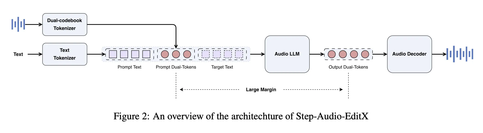 Step-Audio-EditX reuses the Step-Audio twin codebook tokenizer. Speech is mapped into two token streams, a linguistic stream at 16.7 Hz with a 1024 entry codebook, and a semantic stream at 25 Hz with a 4096 entry codebook. Tokens are interleaved with a 2 to three ratio. The tokenizer retains prosody and emotion data, so it isn’t absolutely disentangled.