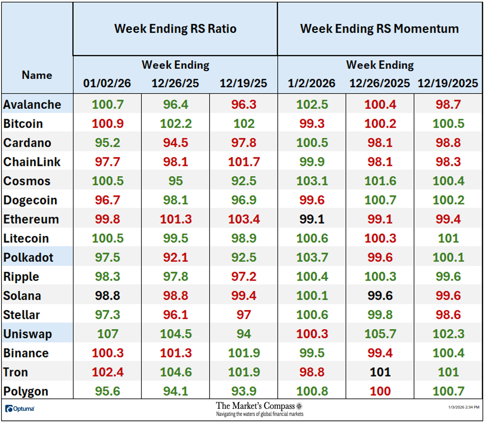 The “Tabulation Desk” beneath marks the Relative Power and Relative Power Momentum readings of the Candy Sixteen vs. the CCi30 Index on the finish of final week and the 2 previous weeks. If there was an enchancment in both the Relative Power Ratio or the Relative Power Momentum studying for the reason that previous week, I’ve highlighted it in inexperienced. If there was a contraction in each it’s highlighted in purple and an unchanged studying in both will stay black. The colour-coding system has served as a warmth map over the previous three weeks highlighting both the continued enchancment, deterioration, or stasis vs. the benchmark CCi30 Index. The crypto currencies which are within the feedback beneath the RRG chart are highlighted in blue.