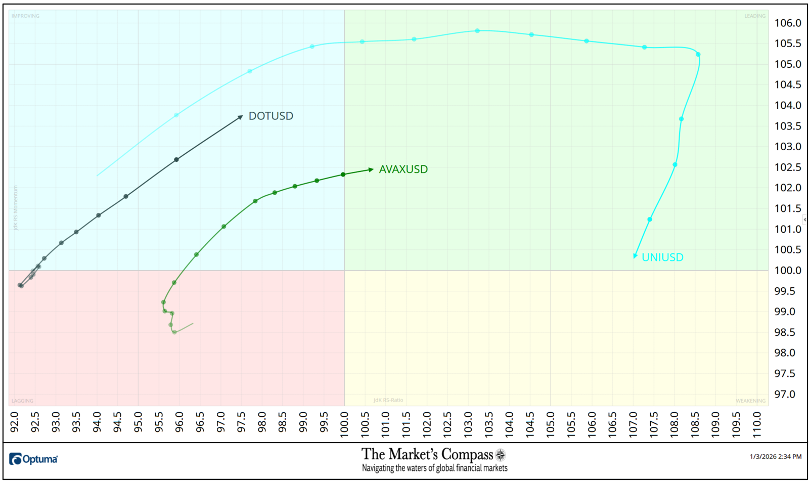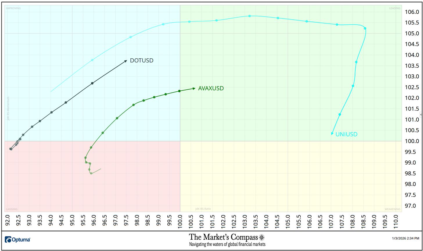 Uniswap (UNI) has been and is noteworthy as will likely be seen not solely right here however within the “Tabulation Desk” beneath. UNI went on to new Relative Power excessive on Monday of final week (a ratio to the benchmark of the CCi30 Index of 108.6) till Relative Power Momentum started to “soften away” because it rolled over within the Main Quadrant leaving it solely in the future of contracting Relative Power Momentum from coming into the Weakening Quadrant. That stated it nonetheless holds the “pole place” of the very best Relative Power vs the Index at 107 as of final Friday. Avalanche (AVAX) has made a 3 Quadrant transfer, rising out of the Lagging Quadrant, driving by way of the Enhancing Quadrant final week to shut Friday within the Main Quadrant. Polkadot (DOT) has escaped the Laging Quadrant after a fast turnaround within the Lagging Quadrant and exhibited optimistic Relative Power Momentum on the finish of final week (notice the space between the each day nodes) because it rises in the Enhancing Quadrant.