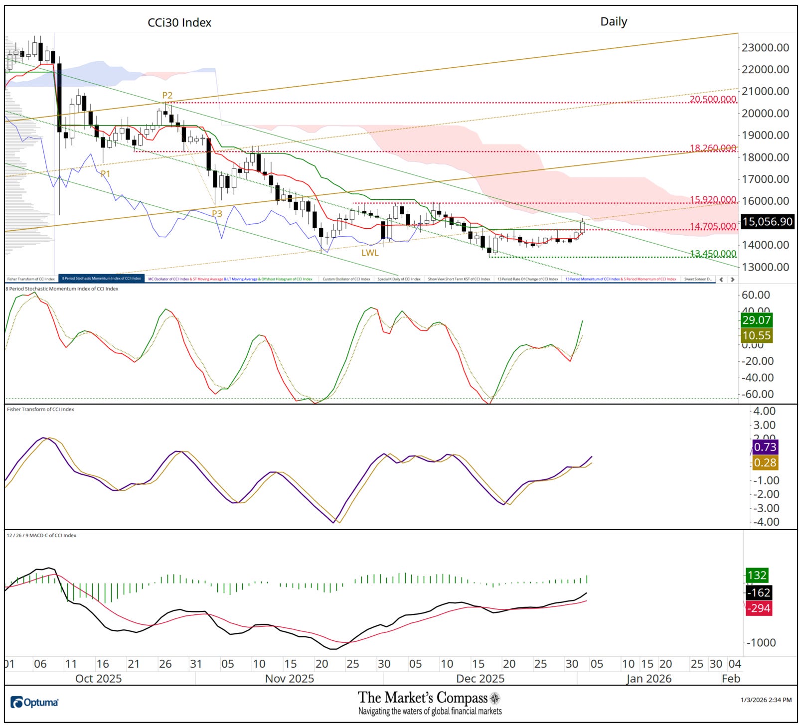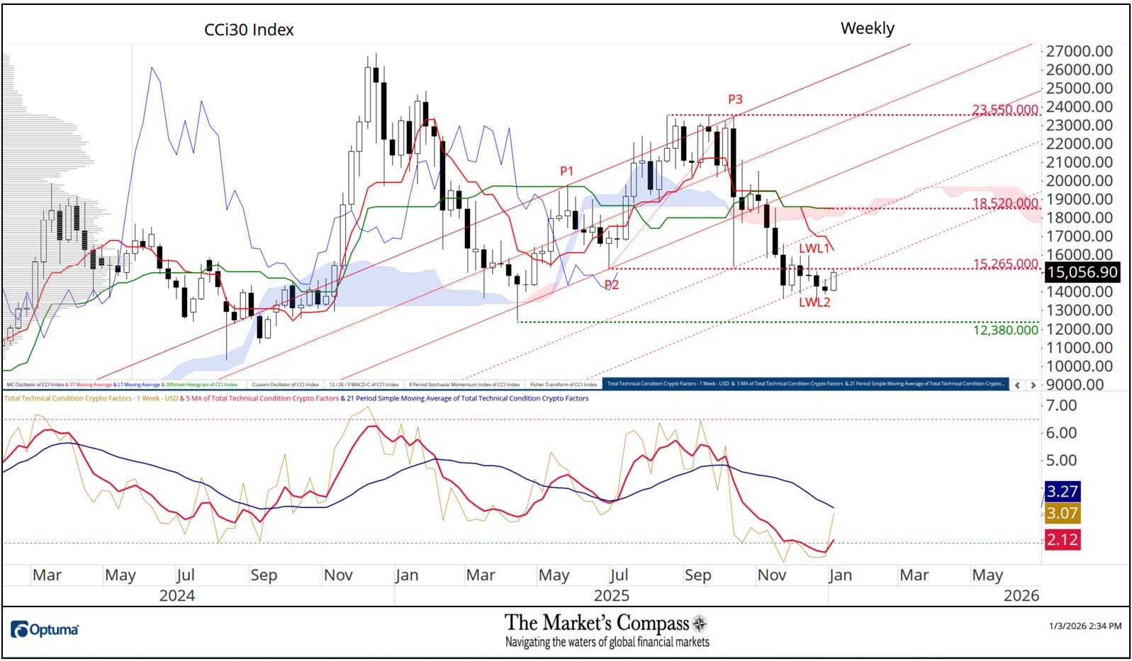 On the finish of final week, the CCi30 Index, which had rallied +6.88% over the earlier seven days, was difficult first resistance on the 15,265.00 degree (on the time of publication the Index was above that degree). The Complete Technical Situation Issue has escaped oversold territory the place it was trapped beneath the shorter-term 5-Week Shifting Common (purple line) which till the tip of final week had been in a gradual down development since late August. A observe by way of to final week’s flip in value and advance by way of the Tenkan Plot (strong purple line) which is at 16,241, would recommend that the downtrend in weekly costs has reversed and on the very least a measurable countertrend rally has begun.