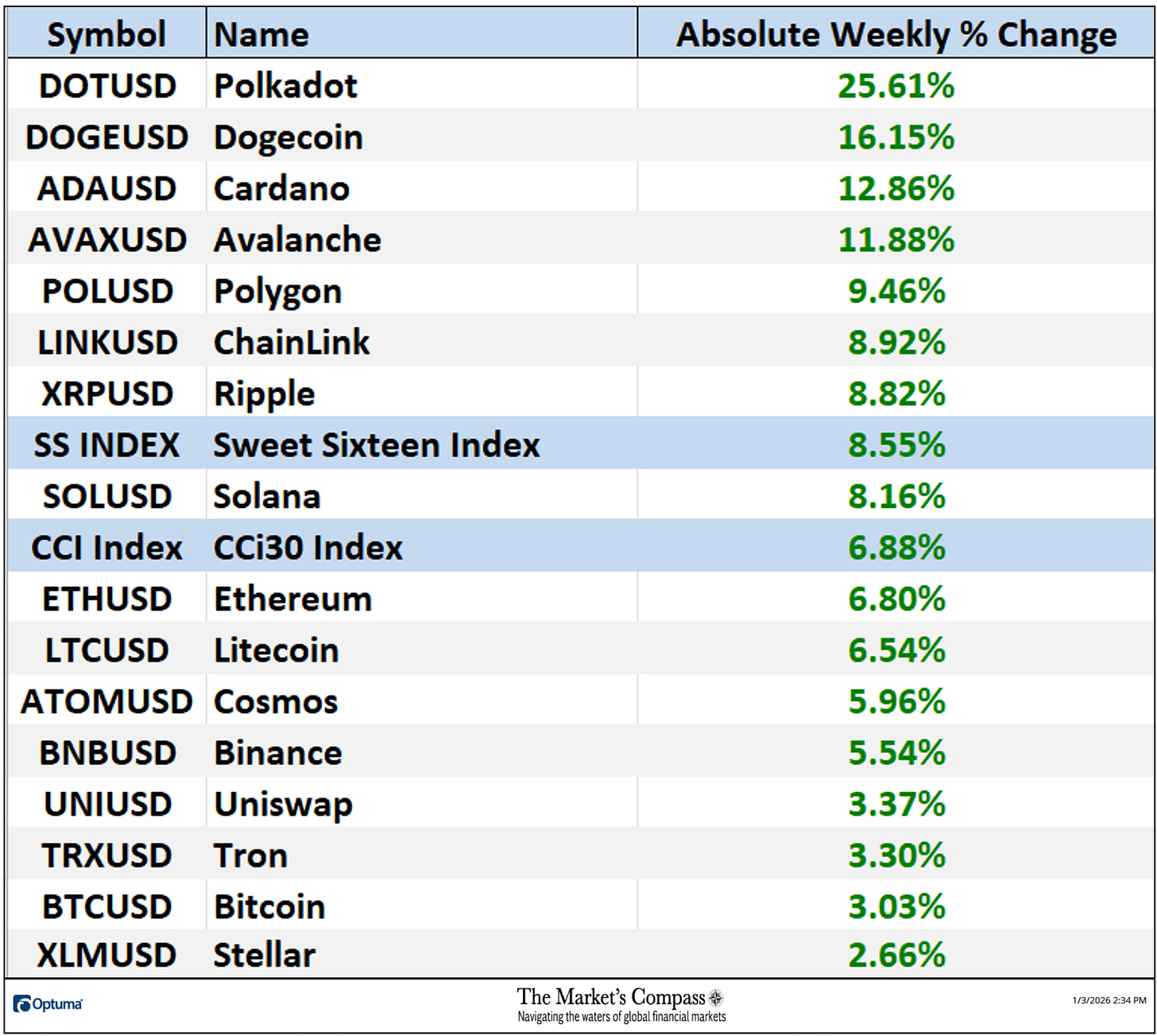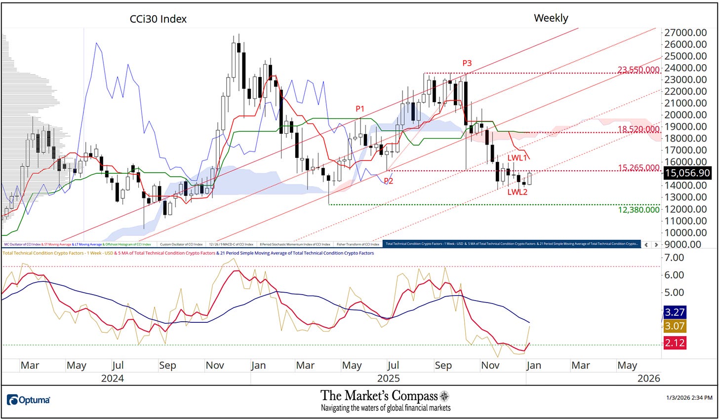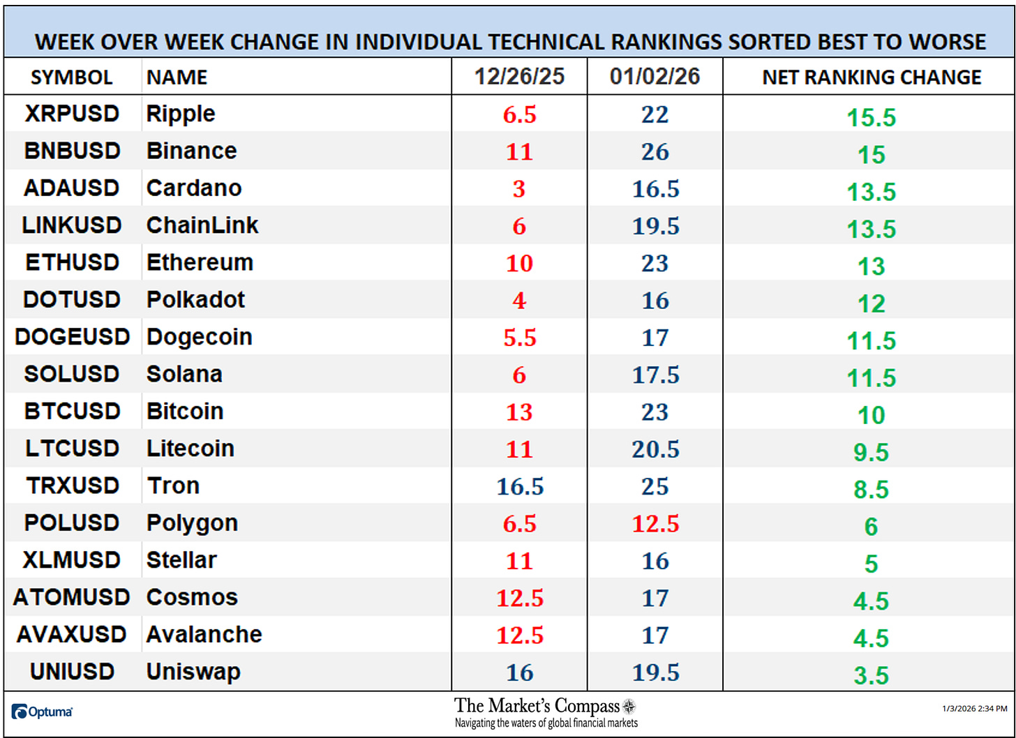 Welcome to this week’s publication of the Market’s Compass Crypto Candy Sixteen Research #223. The Research tracks the technical situation of sixteen of the bigger market cap cryptocurrencies. Each week the Research will spotlight the technical modifications of the 16 cryptocurrencies that I monitor in addition to highlights on noteworthy strikes in particular person Cryptocurrencies and Indexes. As at all times, paid subscribers will obtain this week’s unabridged Market’s Compass Crypto Candy Sixteen Research despatched to their registered e mail Sundays*. Previous publications together with the Weekly ETF Research will be accessed by paid subscribers through The Market’s Compass Substack Weblog.
