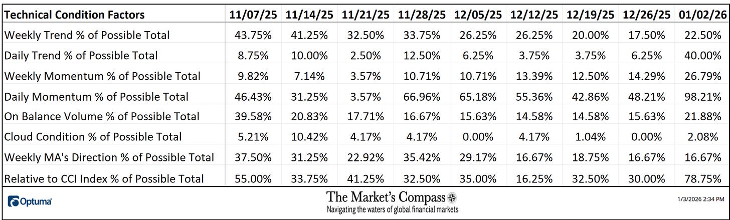 The Day by day Momentum Technical Situation Issue or “DMTCF” rose to 98.21% or 110 out of a potential 112 (marking an overbought situation in Day by day Momentum for the primary time since September) from 48.21% or 54 on the finish of earlier week when it rose after 4 weeks of declines.
