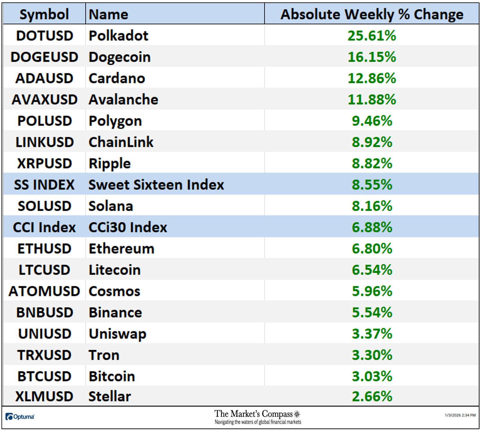 Though not posted on the chart Polkadot closed the week at 2.1643.