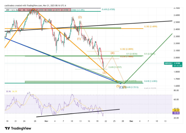 The present bounce again above $1.9 may be trying like a reversal however is definitely a subwave 4 reduction transfer. This implies XRP is quickly recovering from deeply oversold circumstances, but the core market construction nonetheless factors to at least one extra leg decrease earlier than the development shifts.